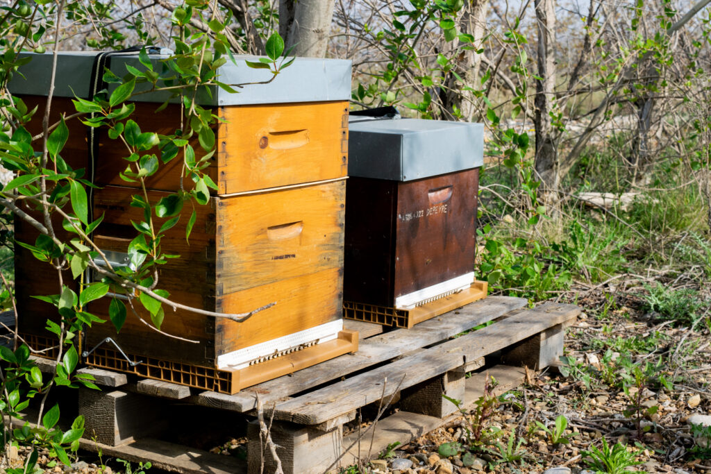 - Des ruches sont installées sur les parcelles pour maximiser la pollinisation. Les abeilles peuvent se nourrir toute l’année grâce aux prairies fleuries et au romarin plantés un peu partout sur l’exploitation.